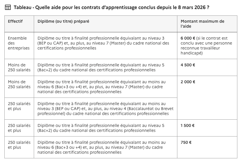 Le décret du 6 mars 2026 pose les montants suivants pour l’aide exceptionnelle à l’apprentissage (cette aide n’est versée qu’au titre de la première année du contrat d’alternance)
