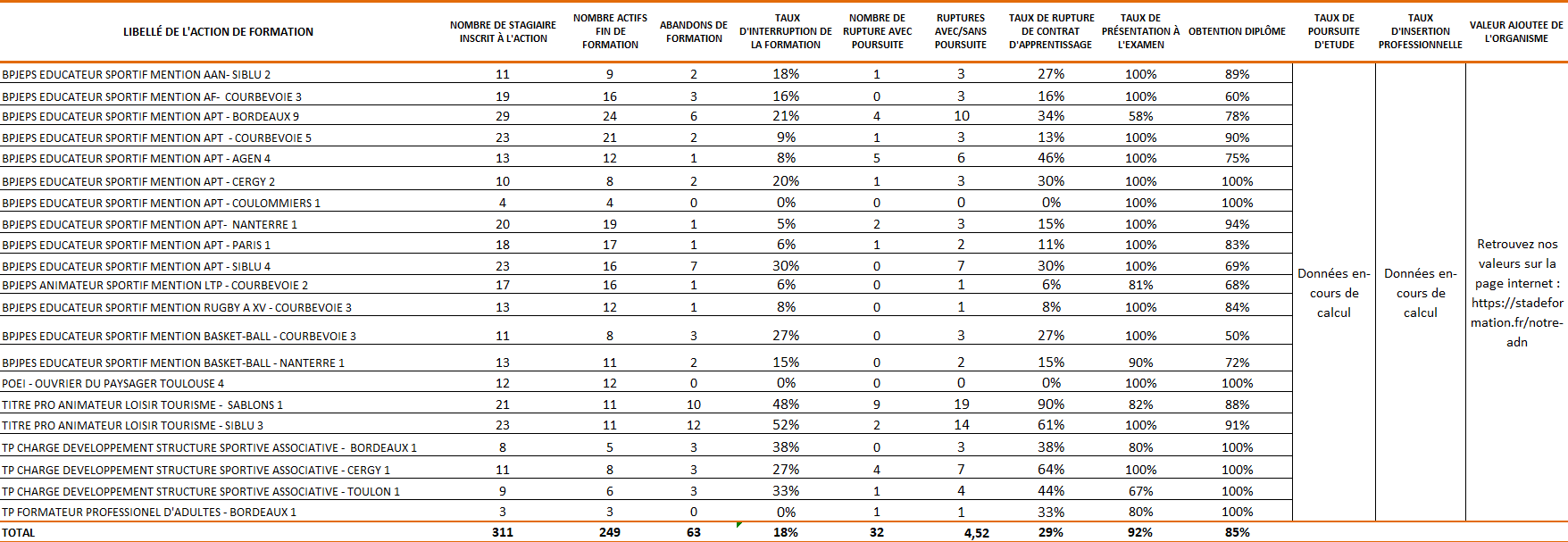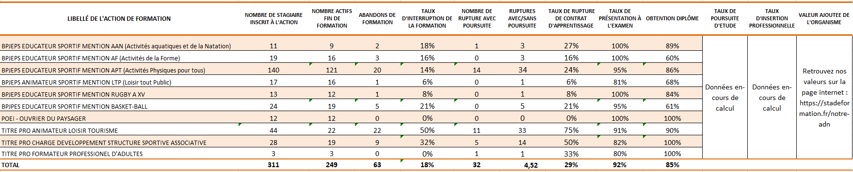 Ces résultats vous sont présentés conformément à l'Article L6111-8 de la Loi du 5 septembre 2018 pour la Liberté de choisir son avenir professionnel, Stade Formation communiquera sur cette page les résultats pour chaque année et chaque diplôme.